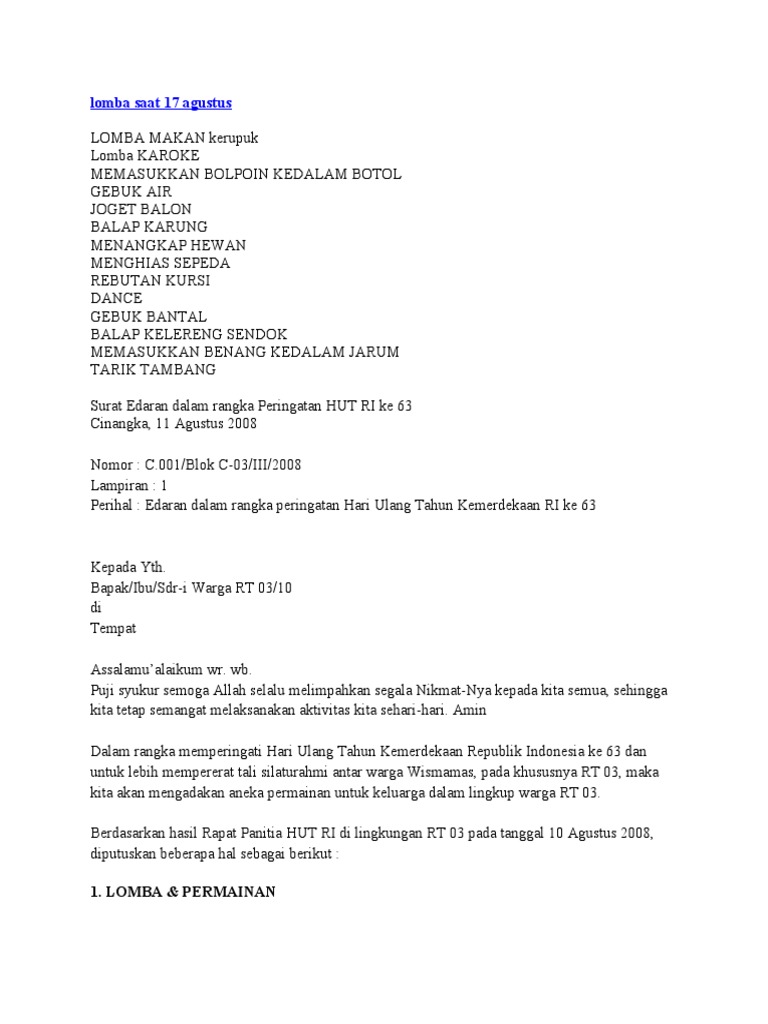 Seluruh rakyat indonesia memperingati hut kemerdekaannya setiap tanggal 17 agustus. Konten ini berisi sebanyak 24 tentang gambar lucu perlombaan 17. Undangan gerak jalan sehat dan perlombaan dalam rangka hut. Untuk belajar contoh proposal 17 agustus. Surat pemberitahuan lomba 17 agustus kabar dd. Penasaran dengan perlombaan 17 agustus yang seru, unik, dan lucu. Proposal biasanya dibuat sebagai gambaran kegiatan atau gambaran suatu lembaga. Perayaan tujuh belas agustusan pada umumnya dilakukan dengan membuat berbagai perlombaan baik untuk anak kecil maupun orang dewasa. Kegiatan 17 agustusan di sekolahku. Dalam rangka memperingati hari kemerdekaan indonesia yang jatuh pada tanggal 17 agustus. Kumpulan contoh wawaran secara tulisan dalam acara lomba 17 agustusan. Cara membuat dan contoh proposal 17 agustus yang benar ini diperlukan agar permohonan dana pada donatur tersampaikan dengan baik. Menjadi panitia hut ri ke 73 pasti anda disibukkan dengan berbagai macam kegiatan perlombaan.